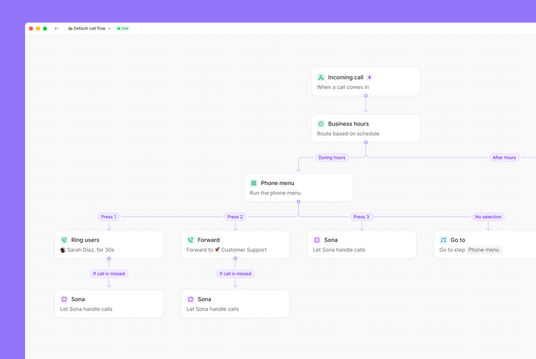 You can now create multiple call flows for different schedules or teams, and easily switch from your default call flow to an additional one — making it seamless to use different call flows for holidays, special hours, or seasonal changes. 💡 Pro tip: Use multiple call flows to create special routing for holidays, events, or emergency situations. Set up the flow in advance and easily activate it when needed. |
